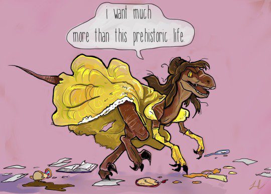 Princesas da Disney transformadas em velociraptors by Laura Cooper, que ainda ‘adapta’ as músicas das heroínas para dinossauros.