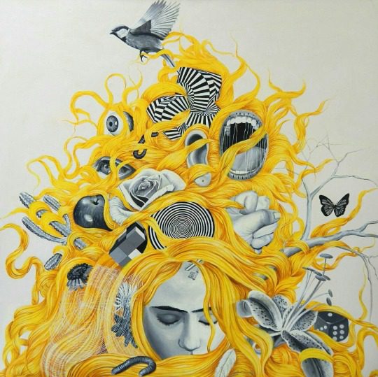 the colection “Why should I tell you” by Bushrra Art, who paints hair to present the conection of thoughts, and objects to present the quality what they have as the characteristic of one’s personality. Themes are presented in this way to show that alot of things, facts and objects cause to create a mood, a decission, a personality so not able to understand easily. And most of the time are taken in wrong meaning. So these things elements are not to tell, but to understand with a broader view.